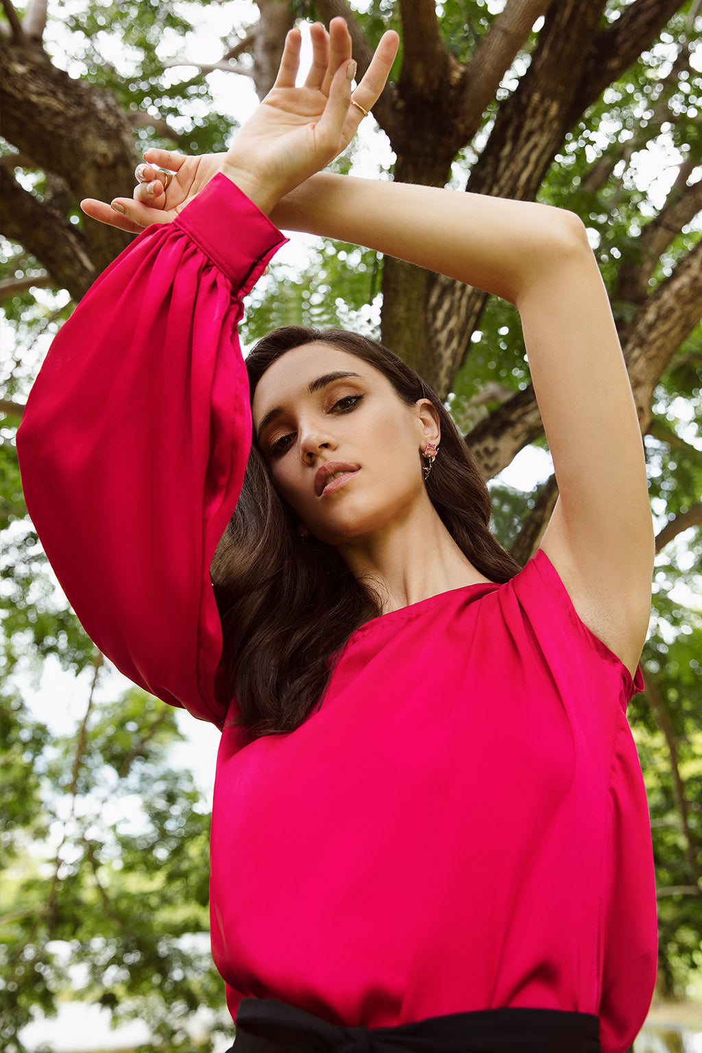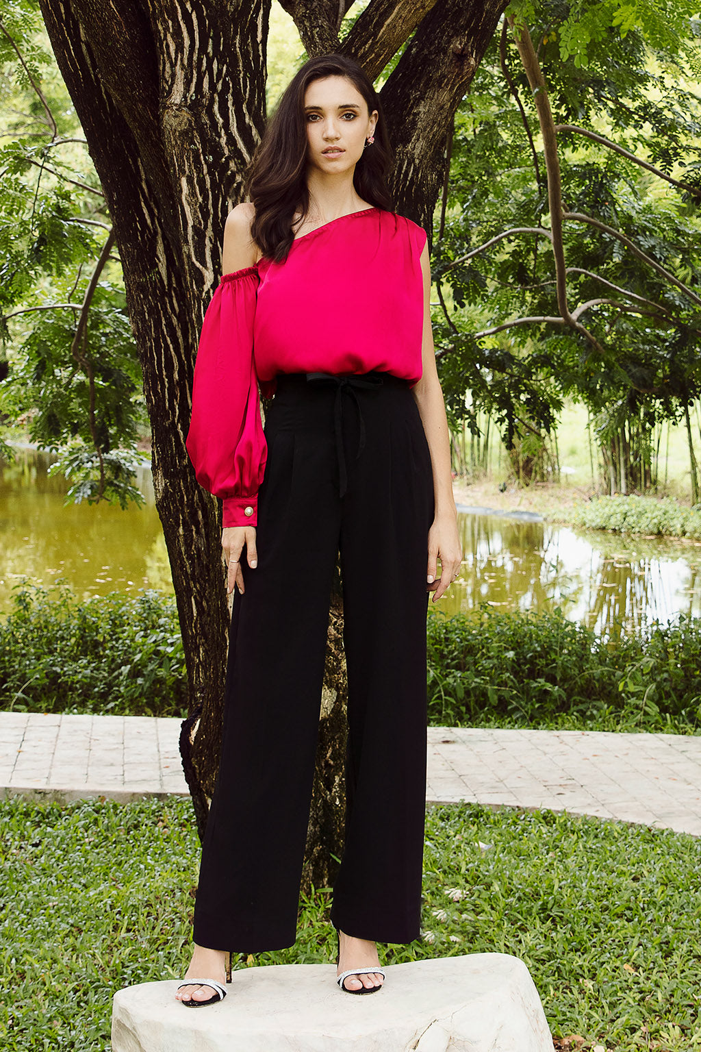 Asymmetrical top made in beautiful shade of berry pink having balloon cuffed sleeve.