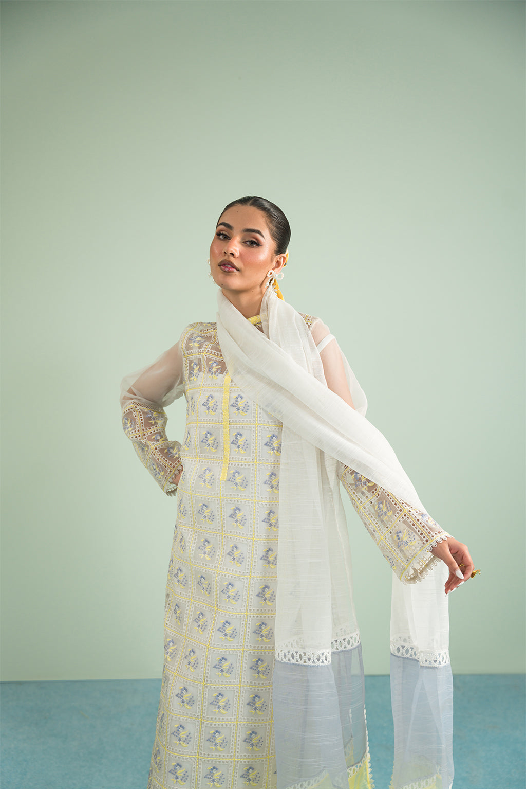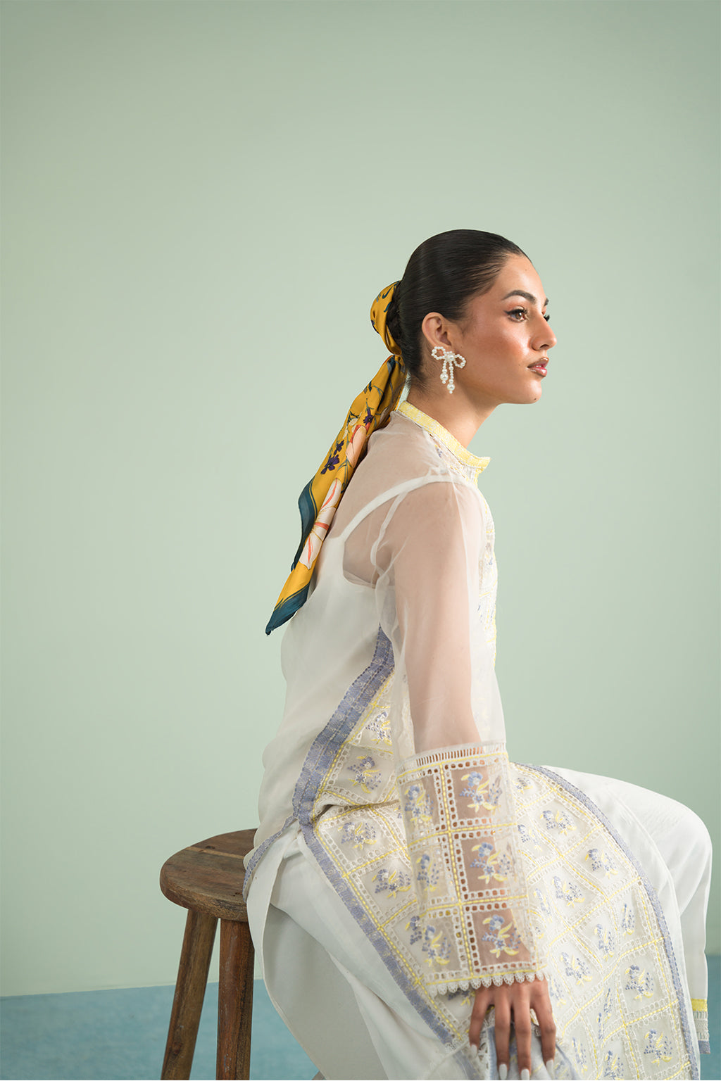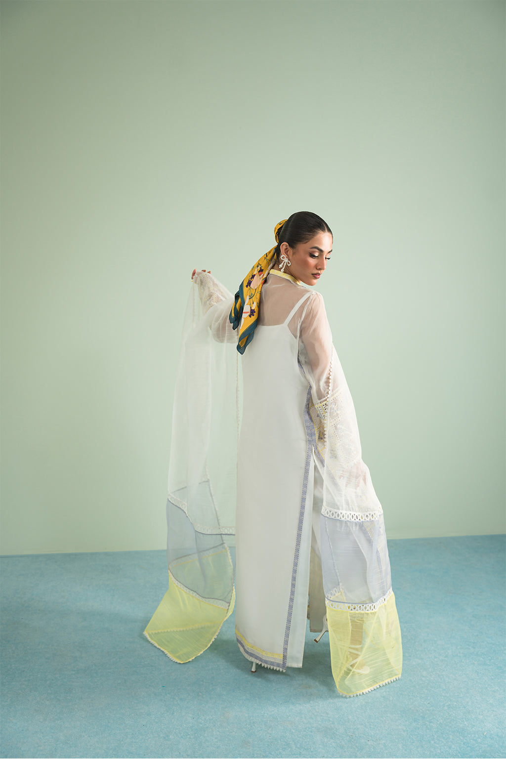 A off white schiili embroidered shirt with lace details on sleeves and damn, paired with straight trouser, organza contrasting dupatta and separate inner