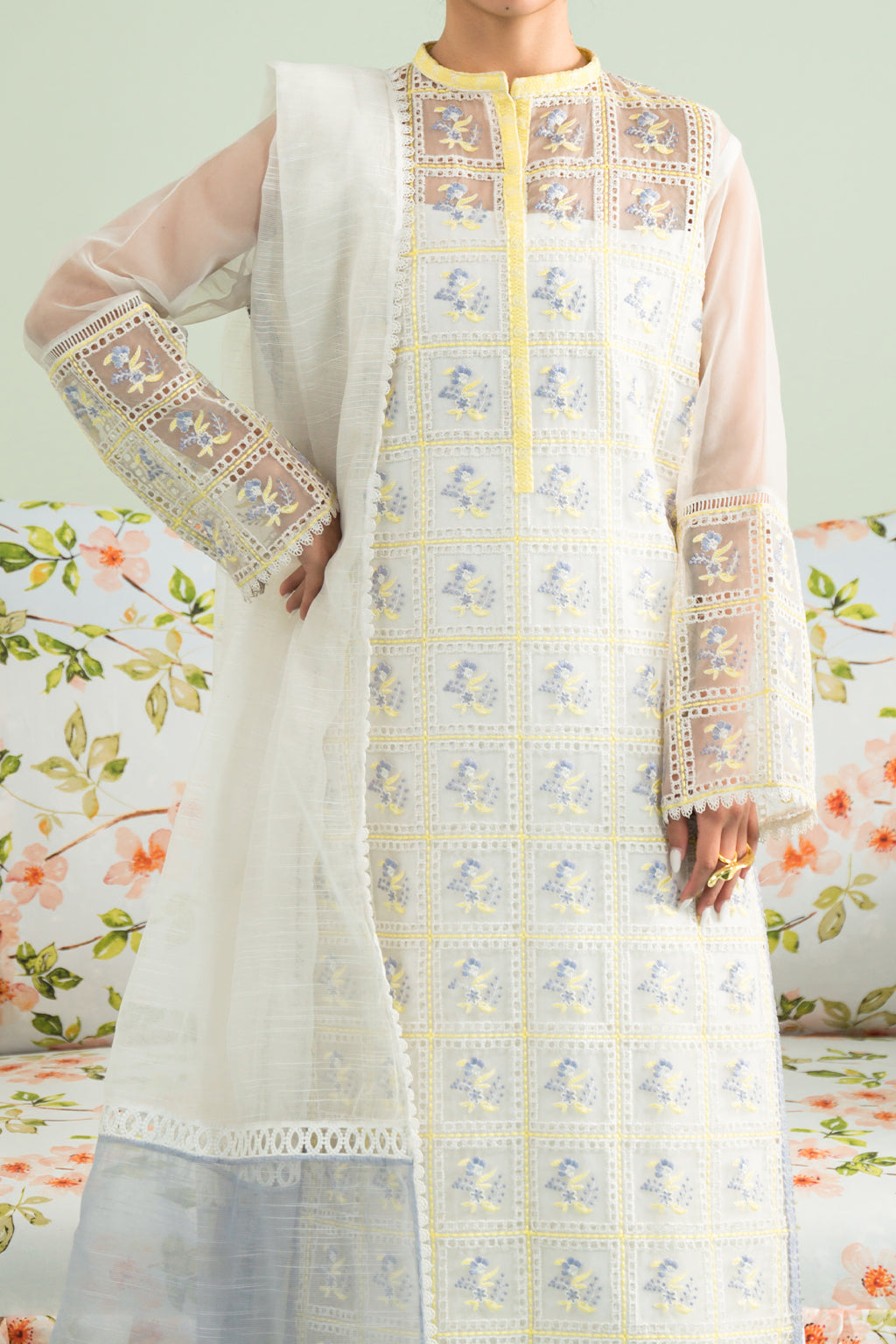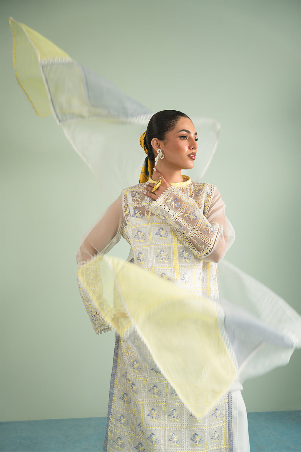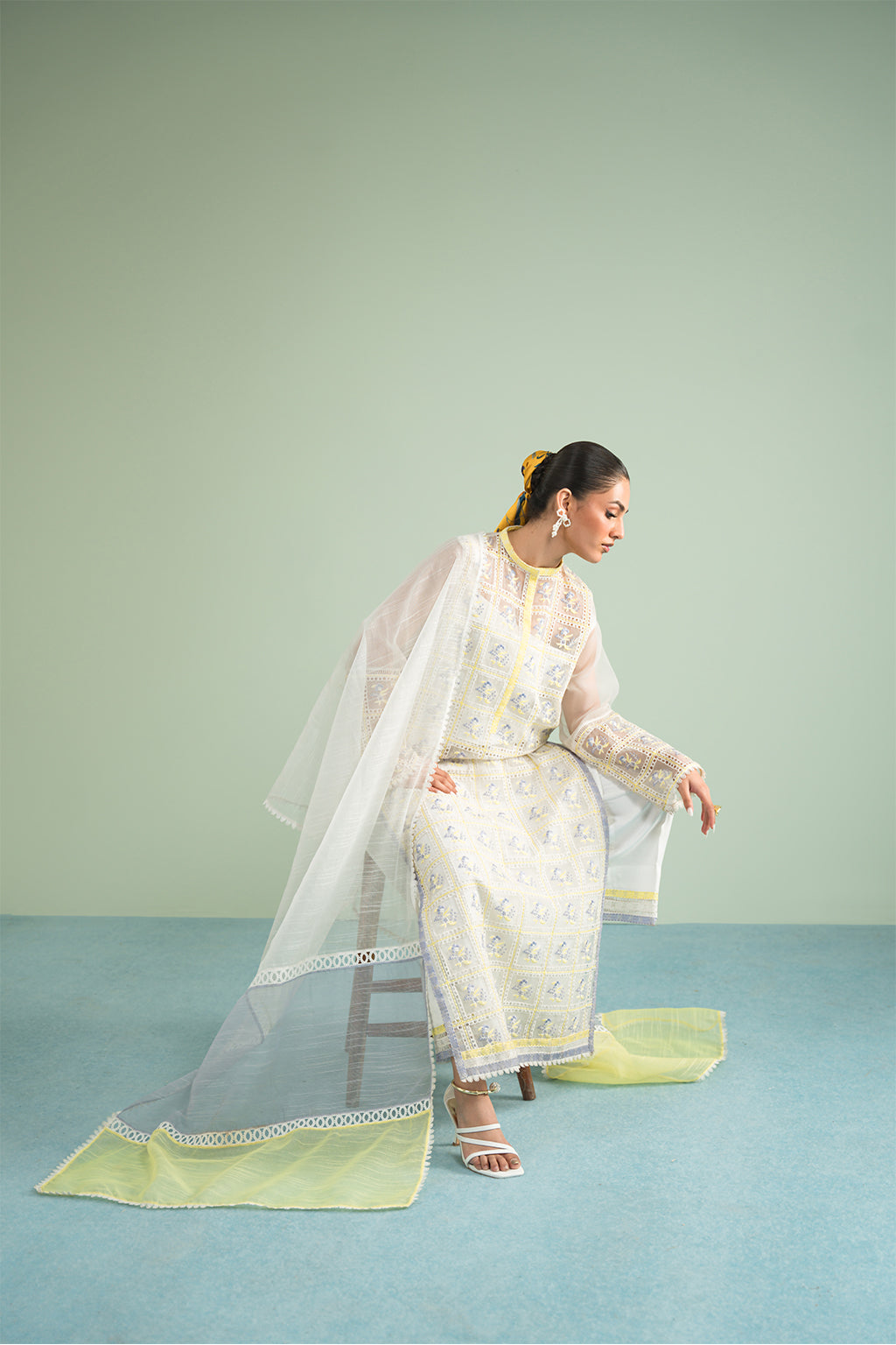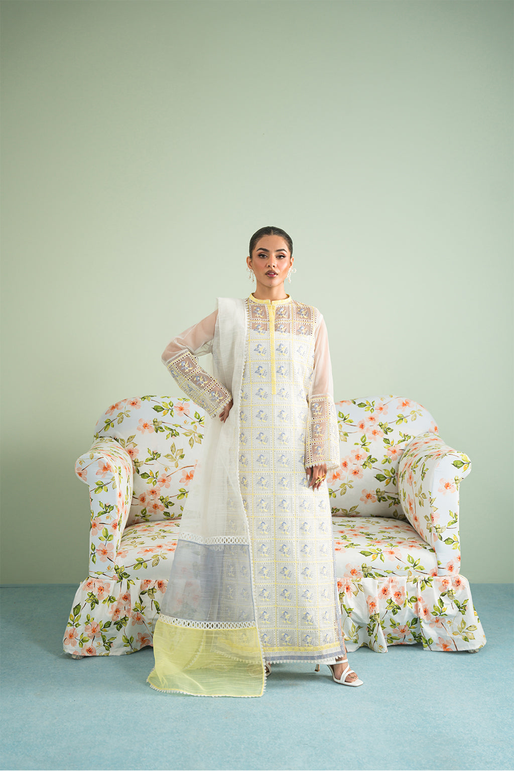 A off white schiili embroidered shirt with lace details on sleeves and damn, paired with straight trouser, organza contrasting dupatta and separate inner