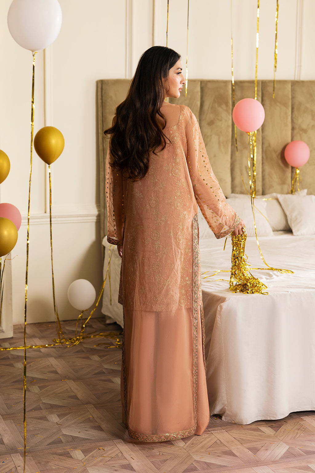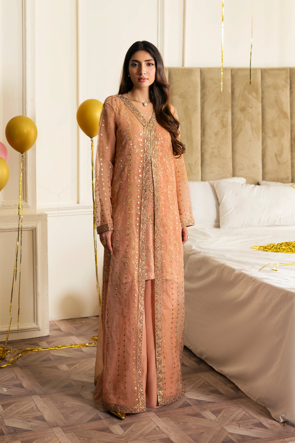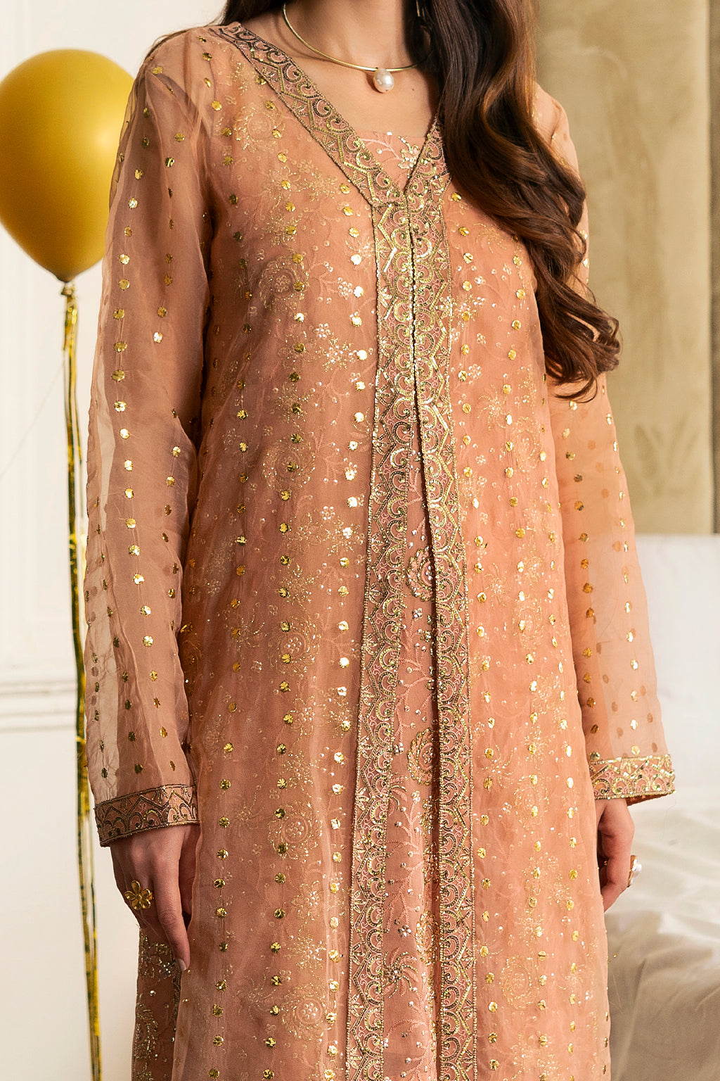 A peach embroidered and mukaish work organza long open jacket with fancy embroidered chiffon inner tunic, paired with wide-legged silk trousers