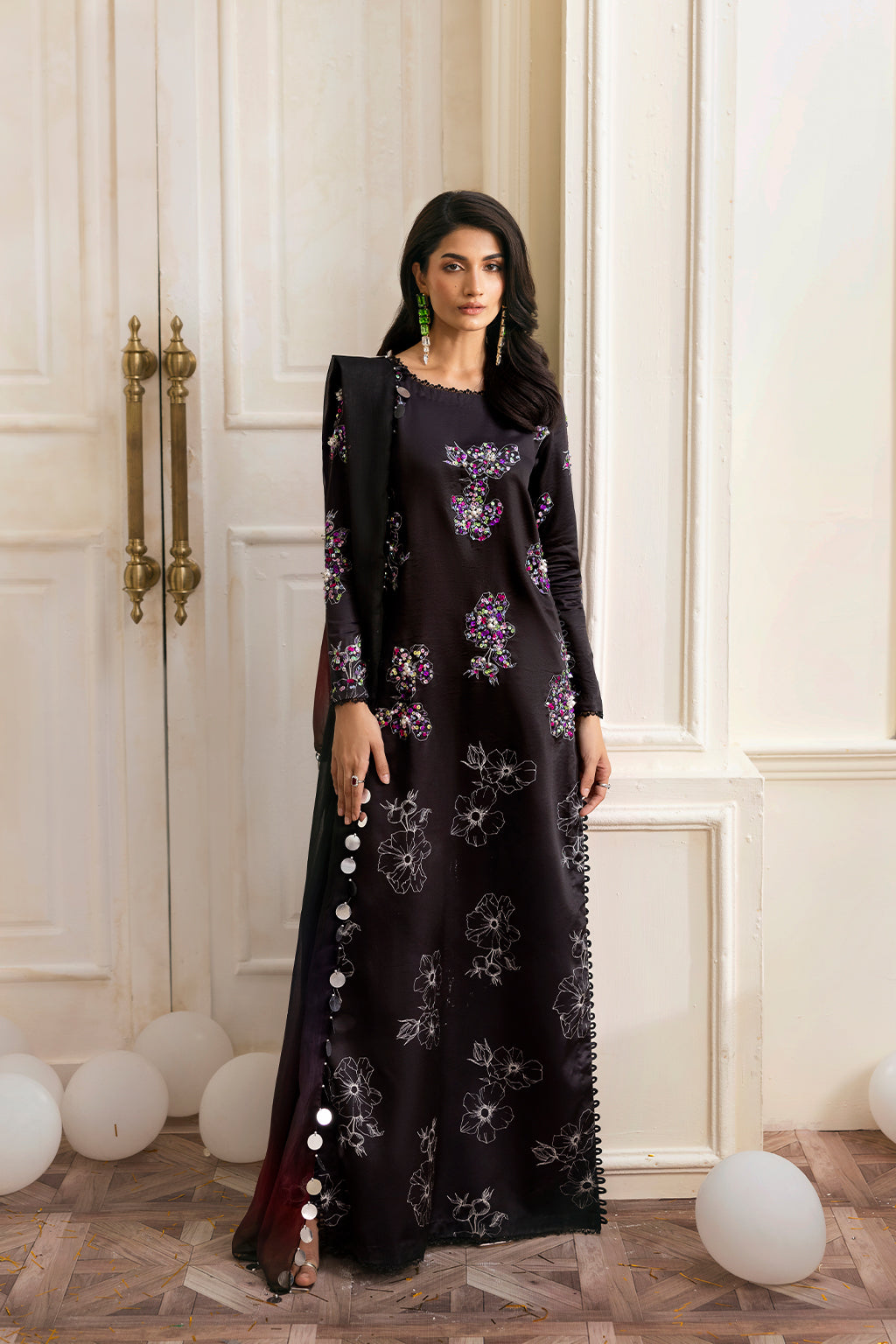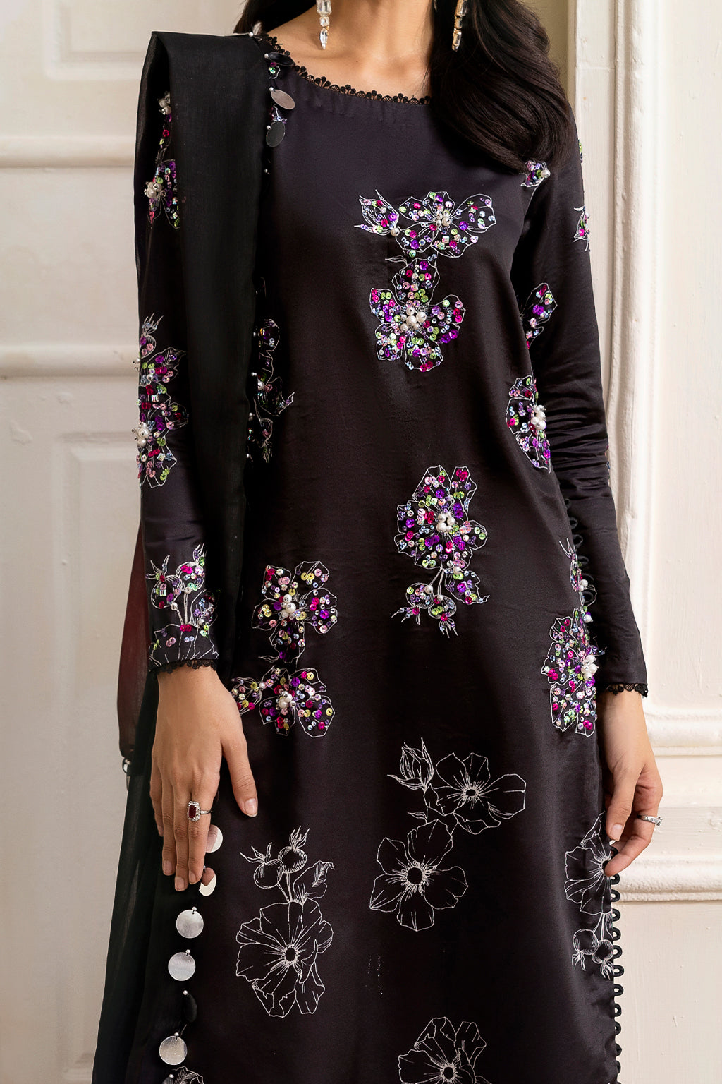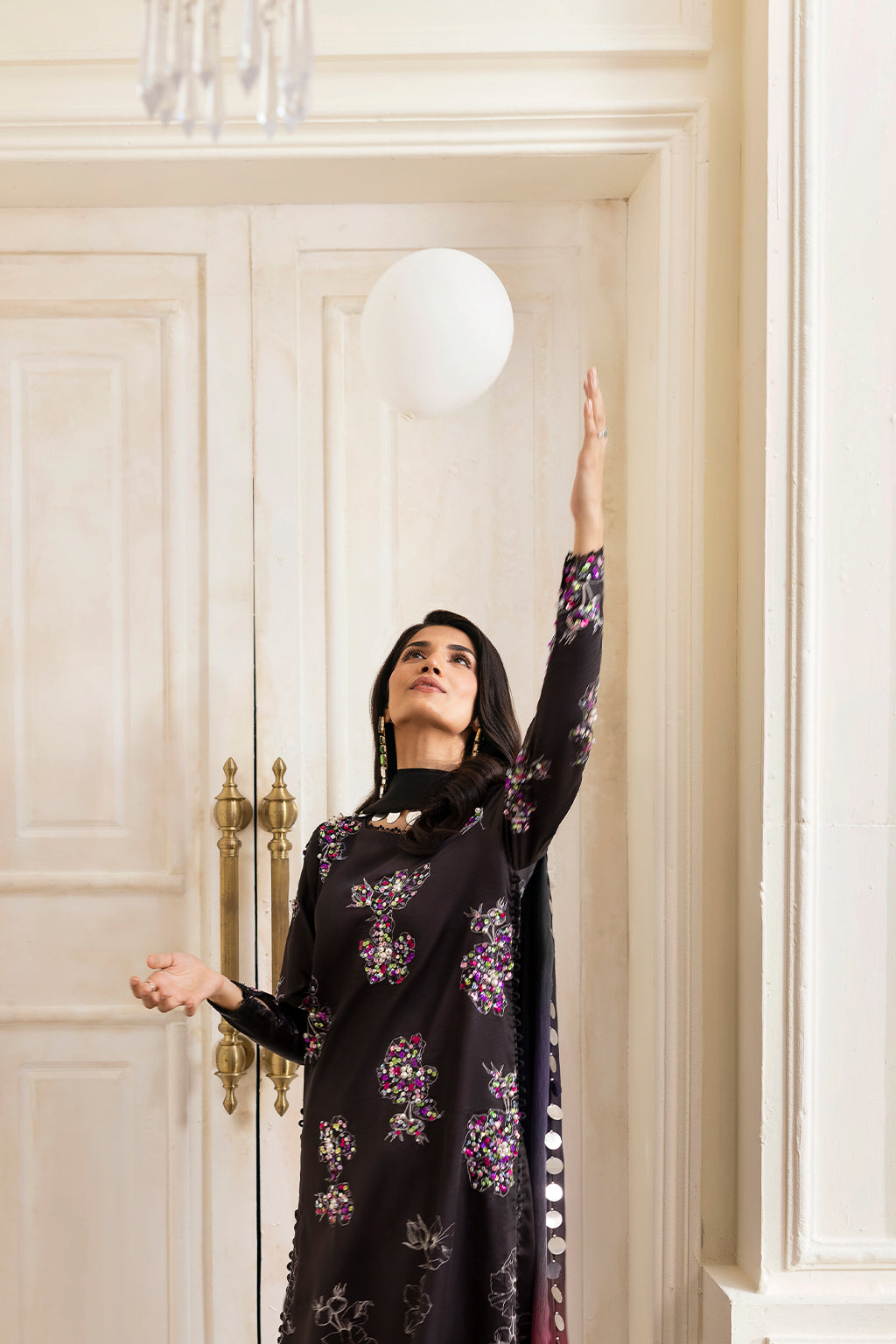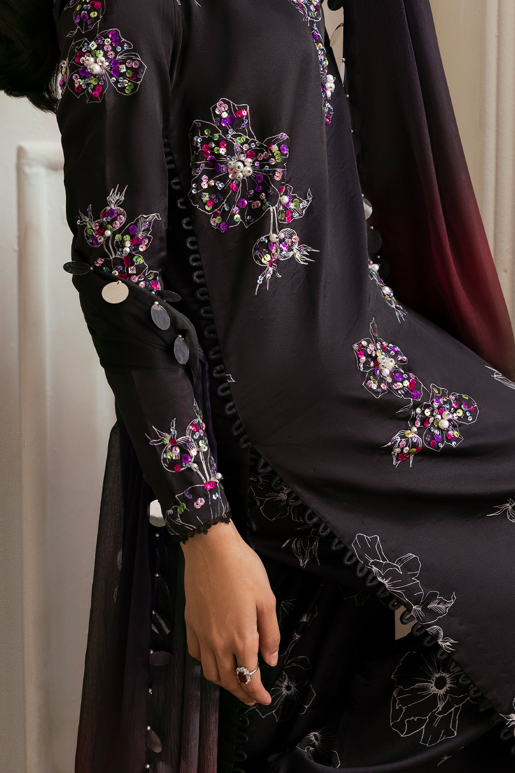 A black long printed shirt featuring hand embellishments on front and sleeves, paired with culottes and printed chiffon dupatta with sequin hangings