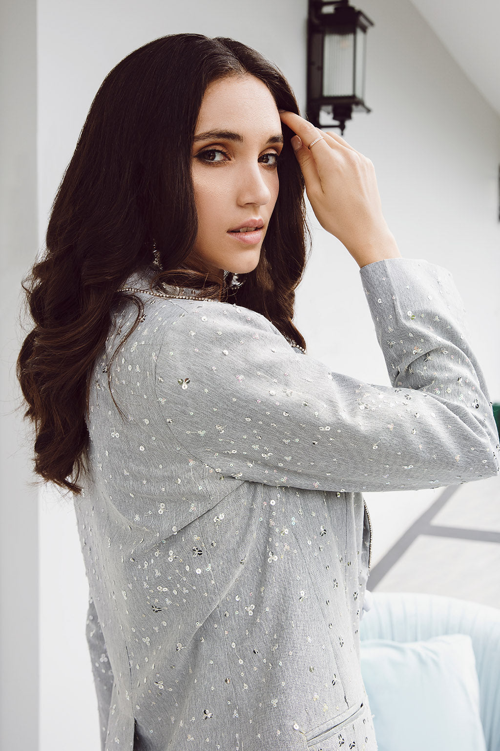 Melange Grey Heavily Embroidered Sequenced Pattern Tailored In A Fine Blazer With Wide Legged Pants.