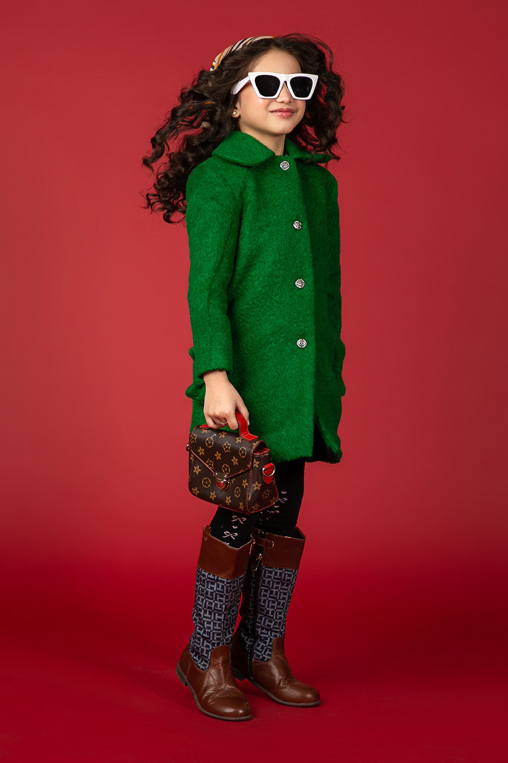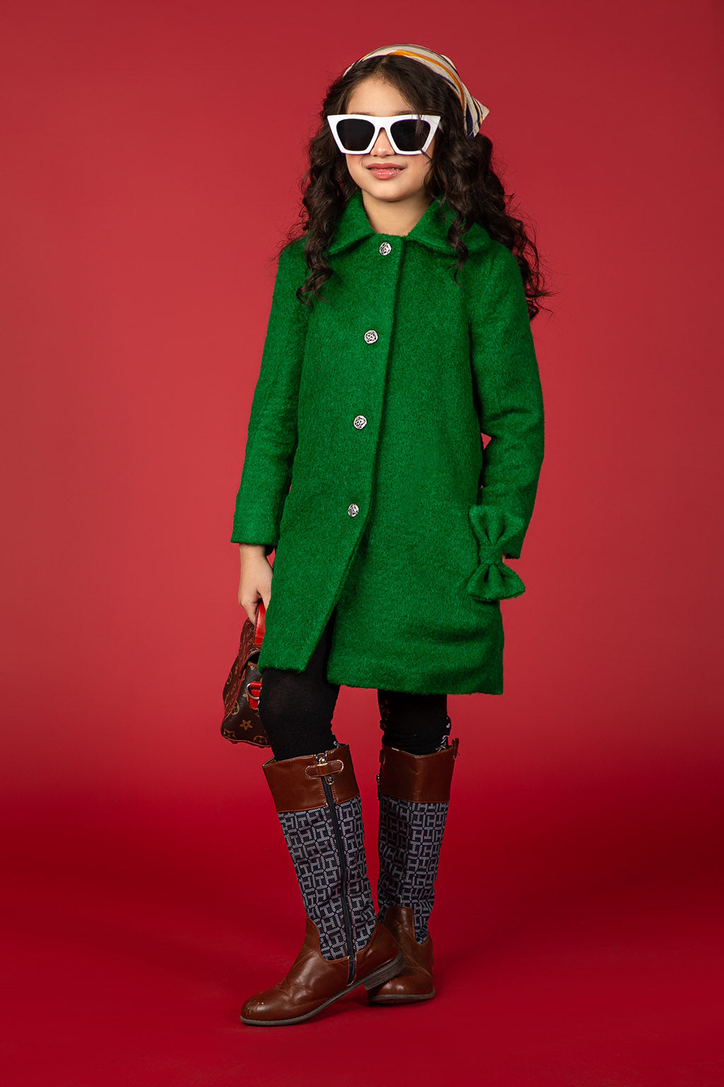 One-piece classic green coat using wool rich blend and designed to fall a slim fitting with studding button details